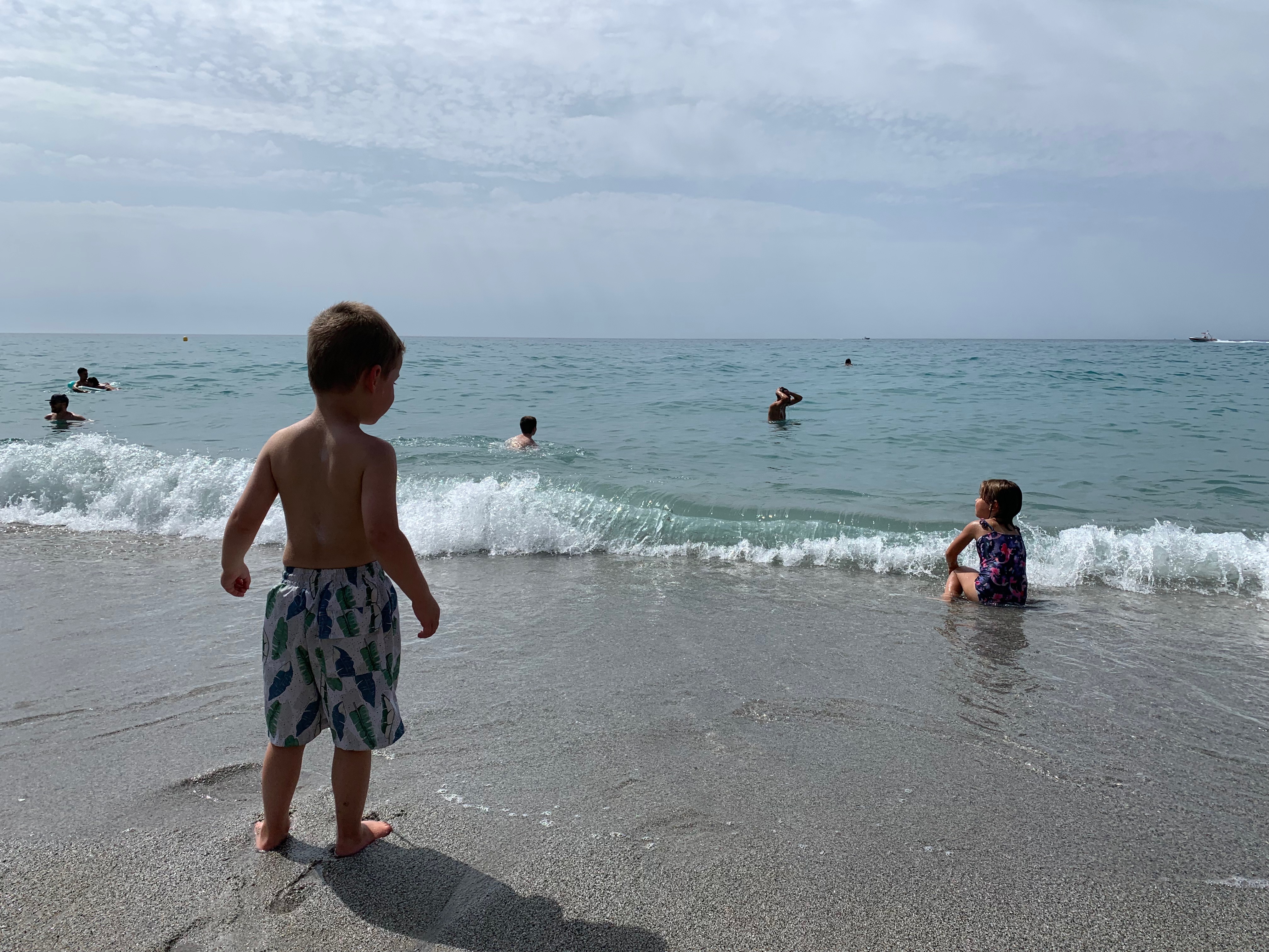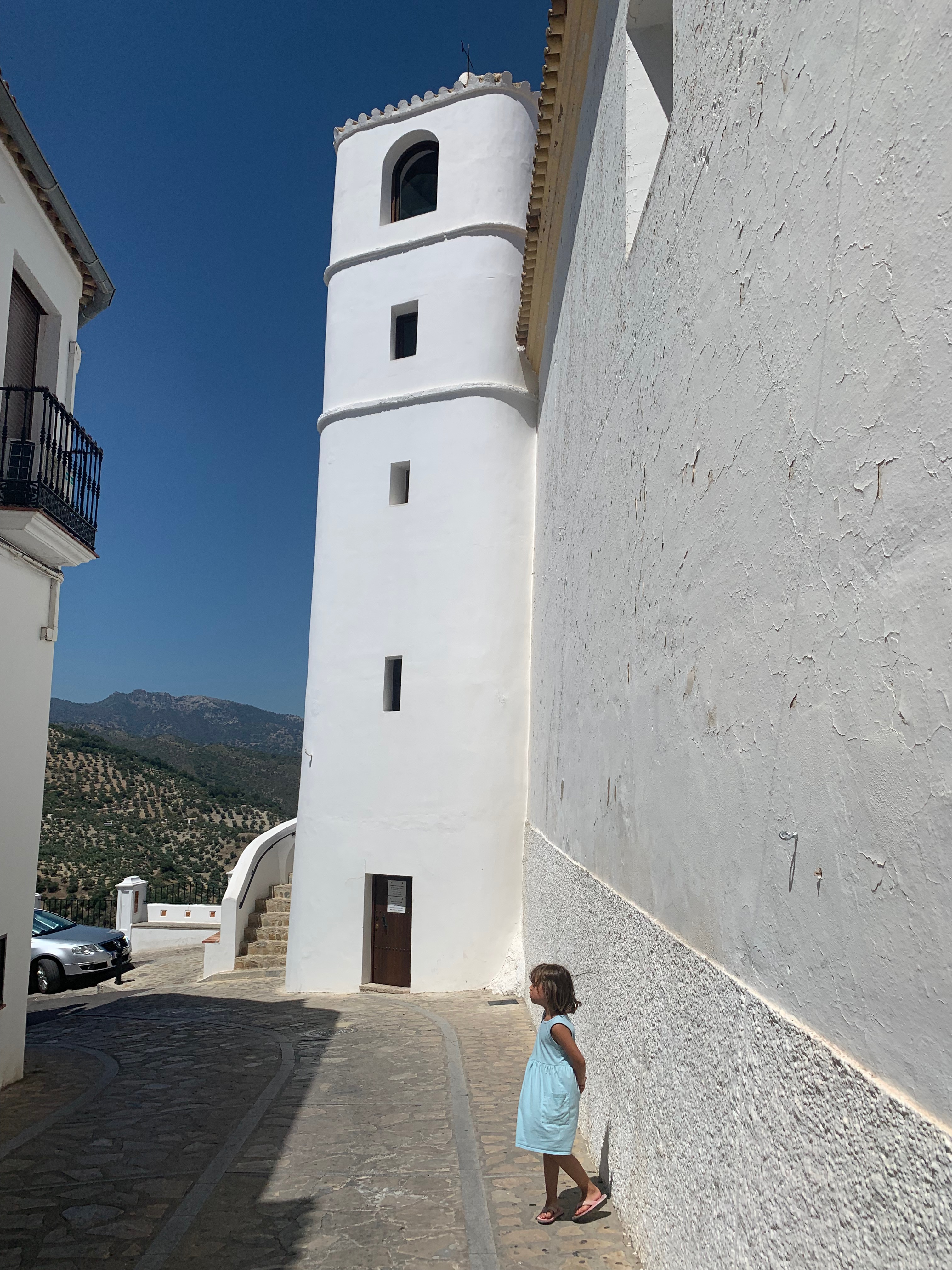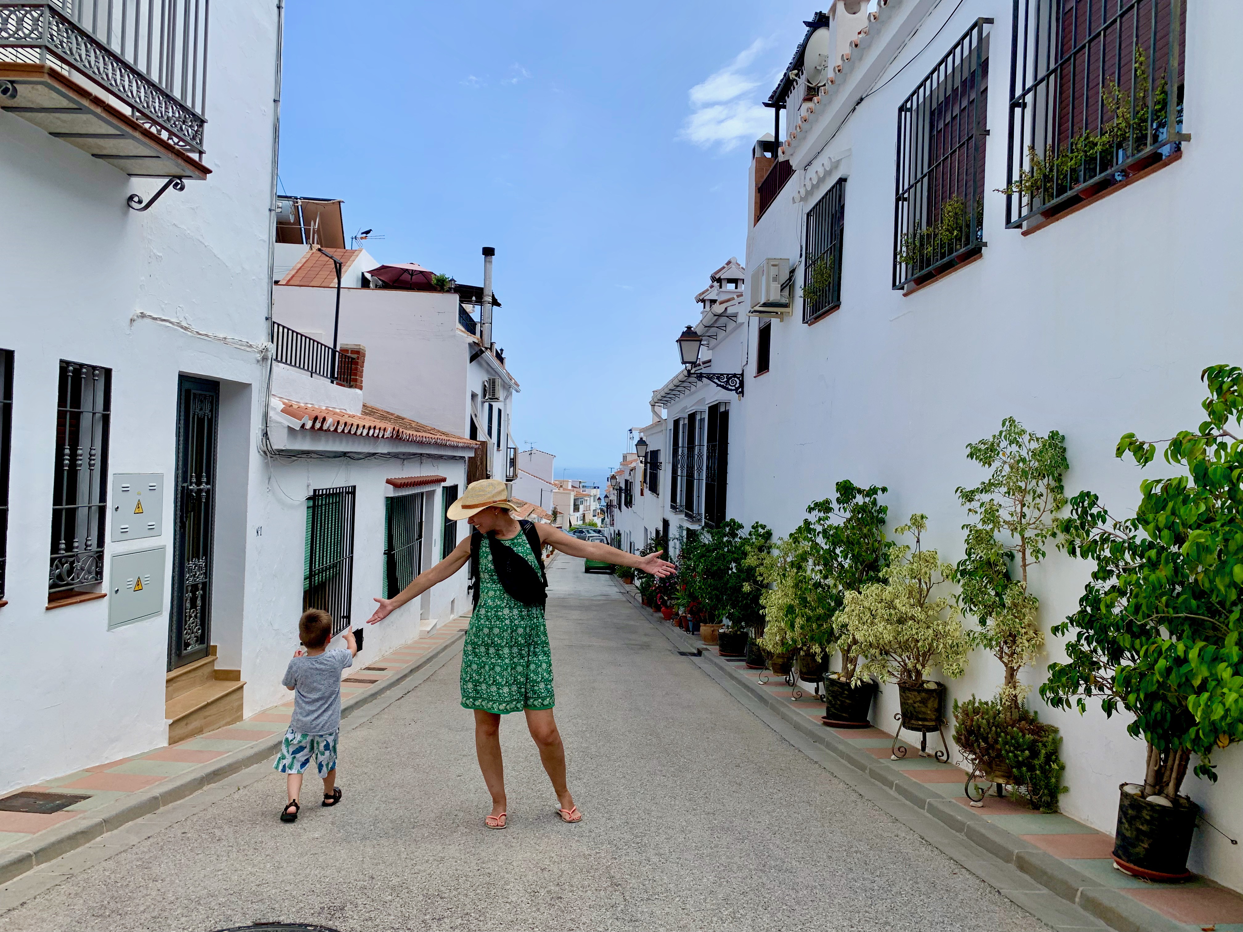 Day 3. Beach trip to Nerja. The south coast of Spain is about one hour drive from Granada so I figured we’ll do a beach day. A brief Google search revealed plenty of beaches in Nerja and so we went. Stopped by Lidl in Nerja, picked up snacks and fruit. The beach was tiny so it was easy to watch the kids. Even R went into the water! I was impressed. Must be that blue water. After about 4 hours at the beach we went to a small village called Frigiliana to have a cold drink and have some ice cream. And then I scratched the car. I bloody put a scratch on our rental, trying to get into the garage in Granada.