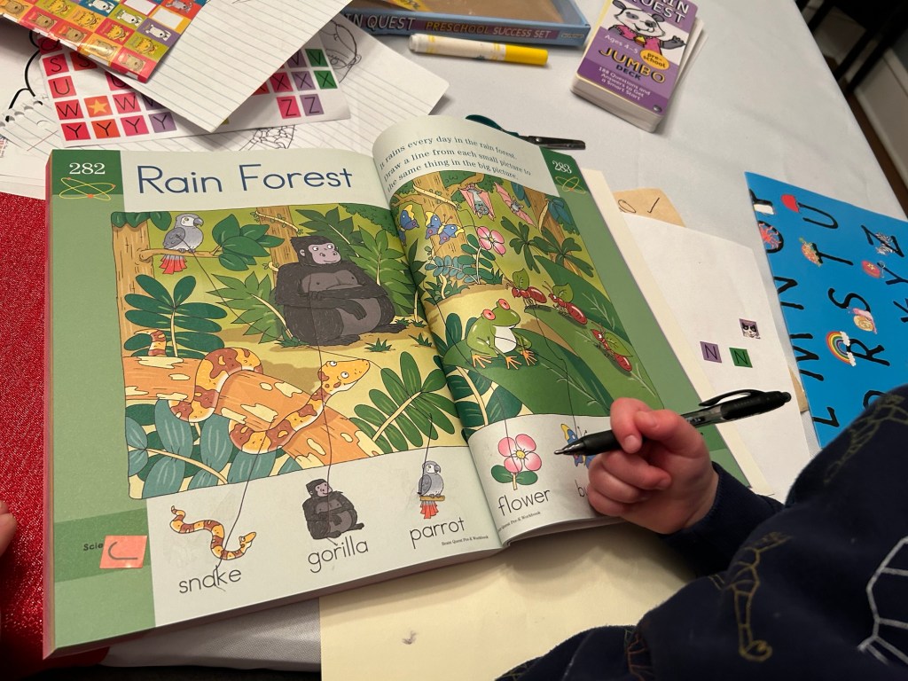 I realized that I never reflected on that week between Christmas and New Years. That week was hard and amazing at the same time. We were circling in each other’s orbits; being happy and being miserable; fighting and hugging. Walks, playing, napping, eating, projects and workbooks, watching movies, playing, outside, eating, napping, watching movies. On repeat. Some lovely impromptu visits to friends and neighbors.