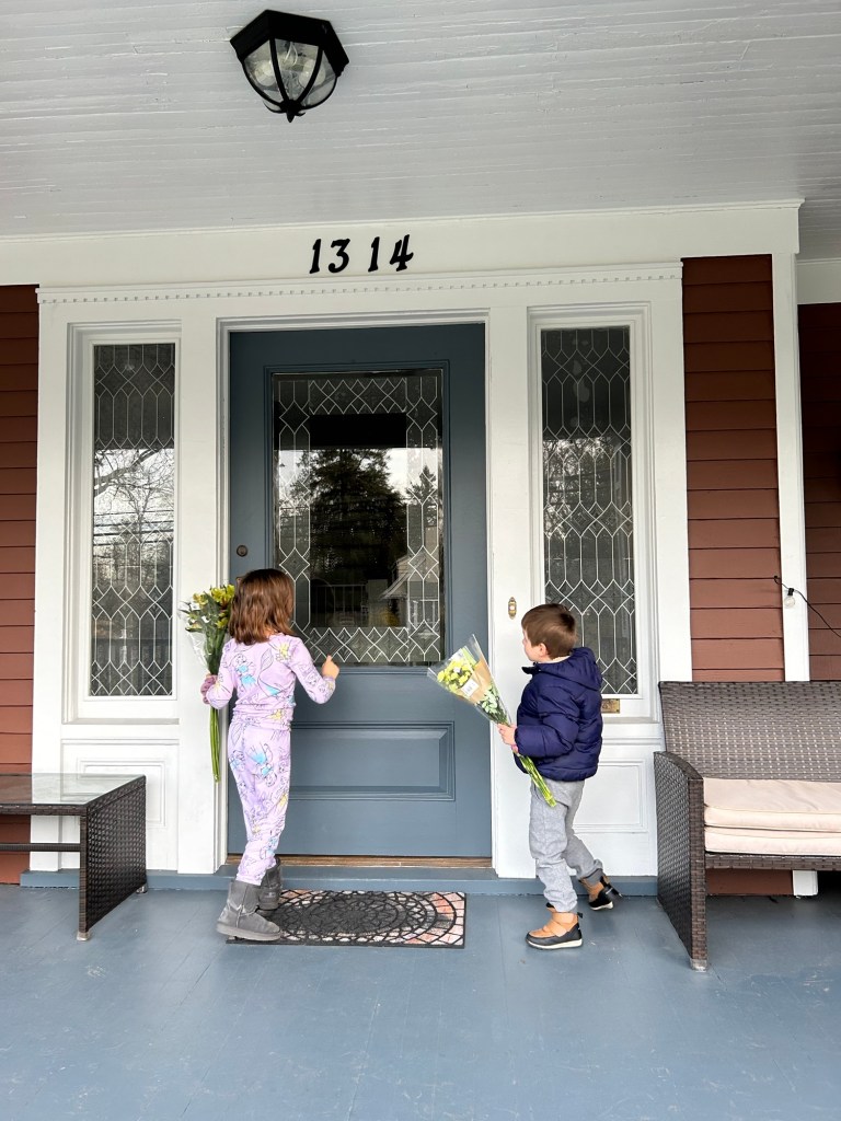 • After pick-up, we delivered yellow flowers in honor of the International Women’s Day to the babushkas: Tanya first, then Lyuba. Mandatory tea and cakes with Nastya followed while the kids played. About an hour and a half later, we were home.