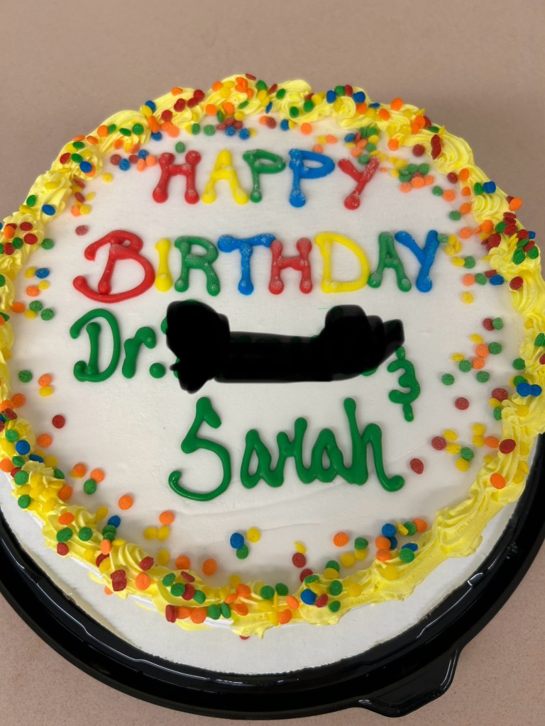 For my birthday, I brought an ice cream cake to work because I shared a birthday with one of my students – Sarah.