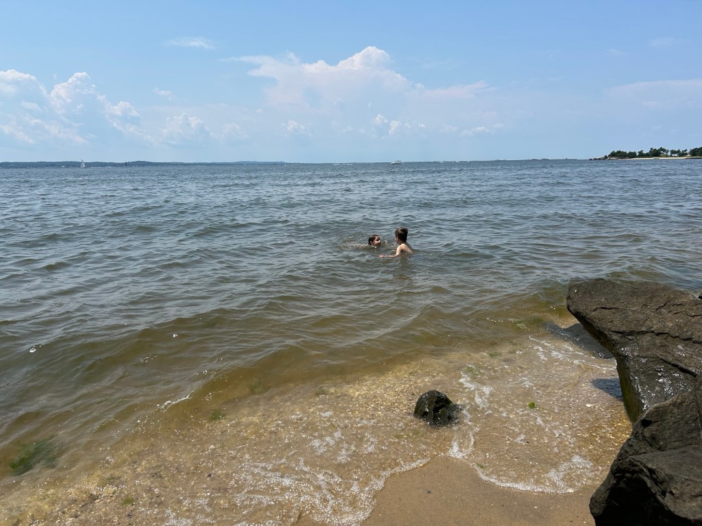 I wasn’t a happy camper and neither were the kids. But, we arrived, parked, and went to the bay side. It has a lot of rocks- huge boulders- that can be interesting to play on.