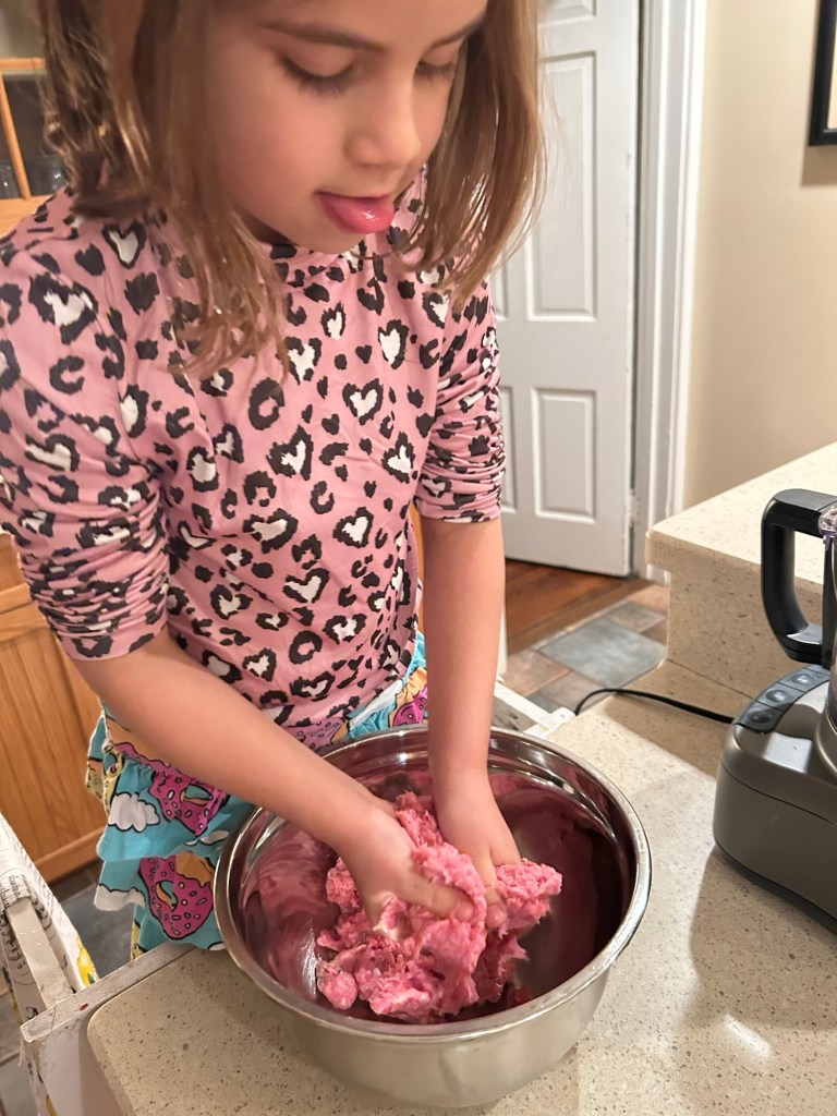 All you do to make kotlety, is mix ground beef and ground pork together, add an egg, some shredded onion, and the middle part (don’t know what it’s called) of the white bread. We didn’t have white bread so we did bread crumbs.