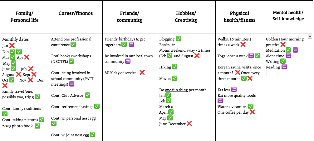 Mid July, I reassessed the chart, saw that many goals where just… I don’t know, far-fetched and unrealistic. One coffee a day? Fun thing per month for myself? MLK day of service?… It was all good intentions and all but I didn’t need to do one fun thing for myself. If I want an ice cream, I will just go get it, it seems silly to have it on a yearly list. MLK day of service has been on my yearly list for many years, I’ve never done it. Here is the list when I reworked it mid year: