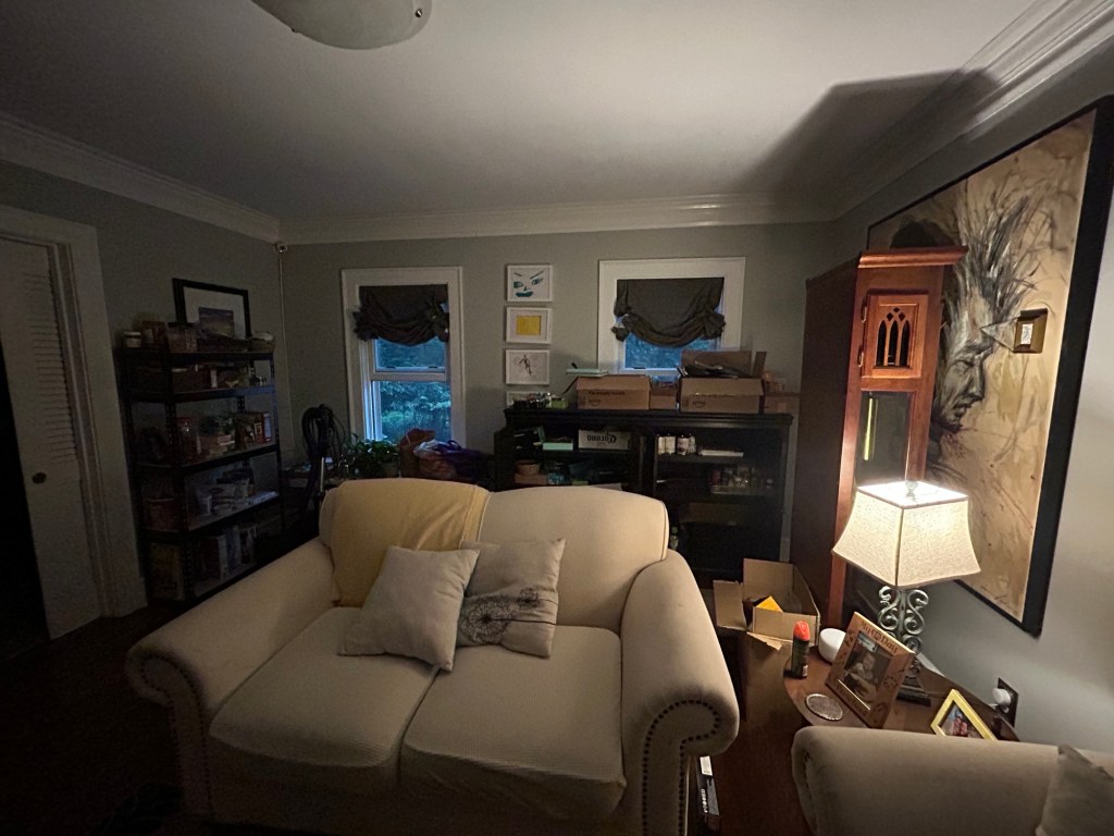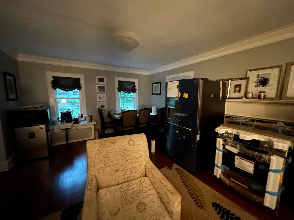 And he wasn’t kidding about the house being messy. All of the old cabinets that were taken down are now stacked in the kitchen. The new appliances that were delivered are in the living room. Heck, everything from the kitchen, the dining room and the butler’s pantry (a small room off the kitchen) IS IN the living room. Here are a few visuals: