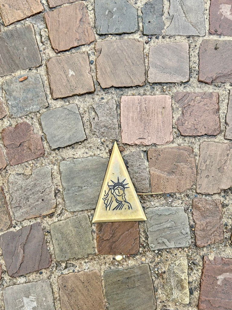 Colmar. It’s a mid size town that serves as a base for many visitors in the area. I liked the buildings/streets but I did NOT like the crowds. It was also chilly and rained for a bit so we ducked into a cafe and had hot chocolates and crêpes, because- any excuse to go to a café, right?!.. Colmar has a huge connection to the US. Read below about the plaques embedded into cobble stones in the streets.