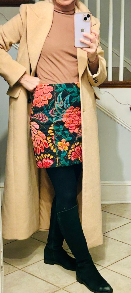 Buuut. On Monday it was cold so I wore a Farm Rio quilted skirt with a tan sweater and black tights. A Farm Rio is a Brazilian clothing brand, sustainable and expensive. They use Brazil’s nature as a background, so think dresses with loud patterns, parrots, flowers, and palm trees. Very beautiful! And very expensive! Their clothes are in $250-$550 range.