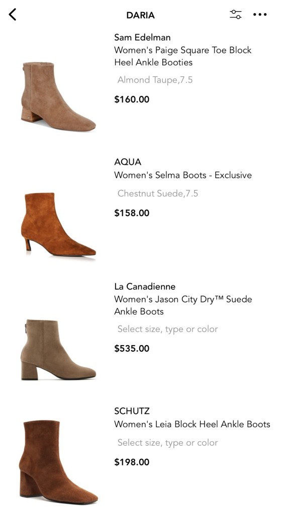 My Thursday boots in brown are going on seven years. They’ve been resolved twice! Below is the new fall booties selection – bought Aqua from Bloomingdale’s, discounted from $158 to $106.