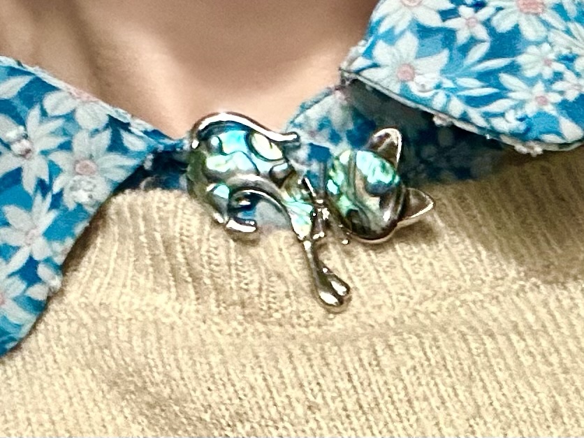 A sweater, a blouse underneath, black pants, and a kitty cat brooch I bought in Paris.