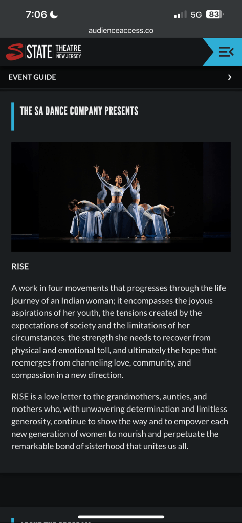 THEN, my daughter and I went to the theater. We saw Sa Dance company perform “Rise” – a visual dance story, with elements of dance, music, and spoken word. In essence, what it’s like to be an Indian girl and then woman and the struggles that arise. I cried my makeup off. The story could be applied to any nationality. Many audience member sat their with their daughters, big and small.