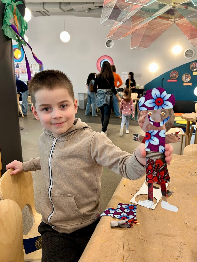 We were at the museum from about 10 to 2pm. It was packed but the kids had fun. A whole section of the museum was set up like a little village, with shops reflecting the communities of Brooklyn: Italian, Haitian, Chinese, Russian. There was a science section and a Color Lab where they made astronaut puppets based on Yinka Shonibare’s art.